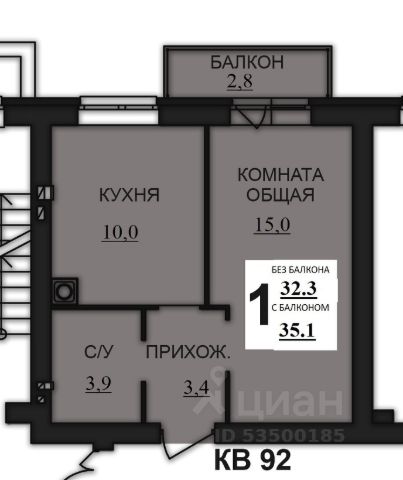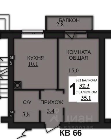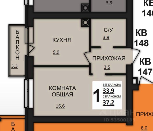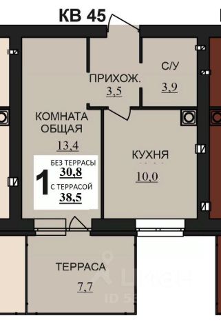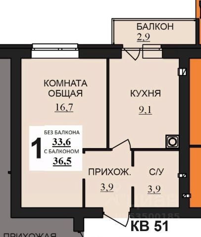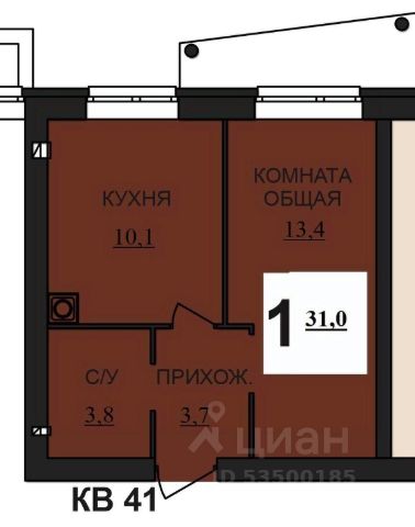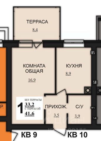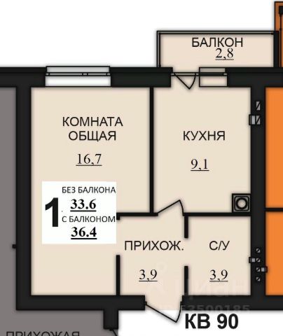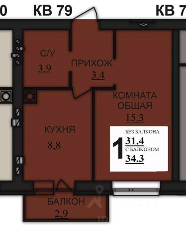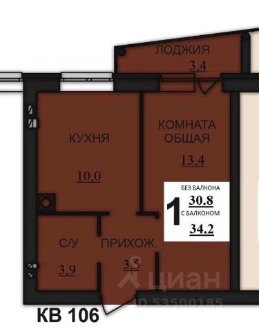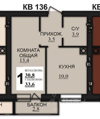 Общая площадь составляет 33.4 кв. метров. Пространство квартиры разделено на следующие помещения: