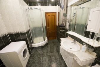 В ванной комнате тёплый пол, душевая кабина и глубокая ванна. Стиральная машина.