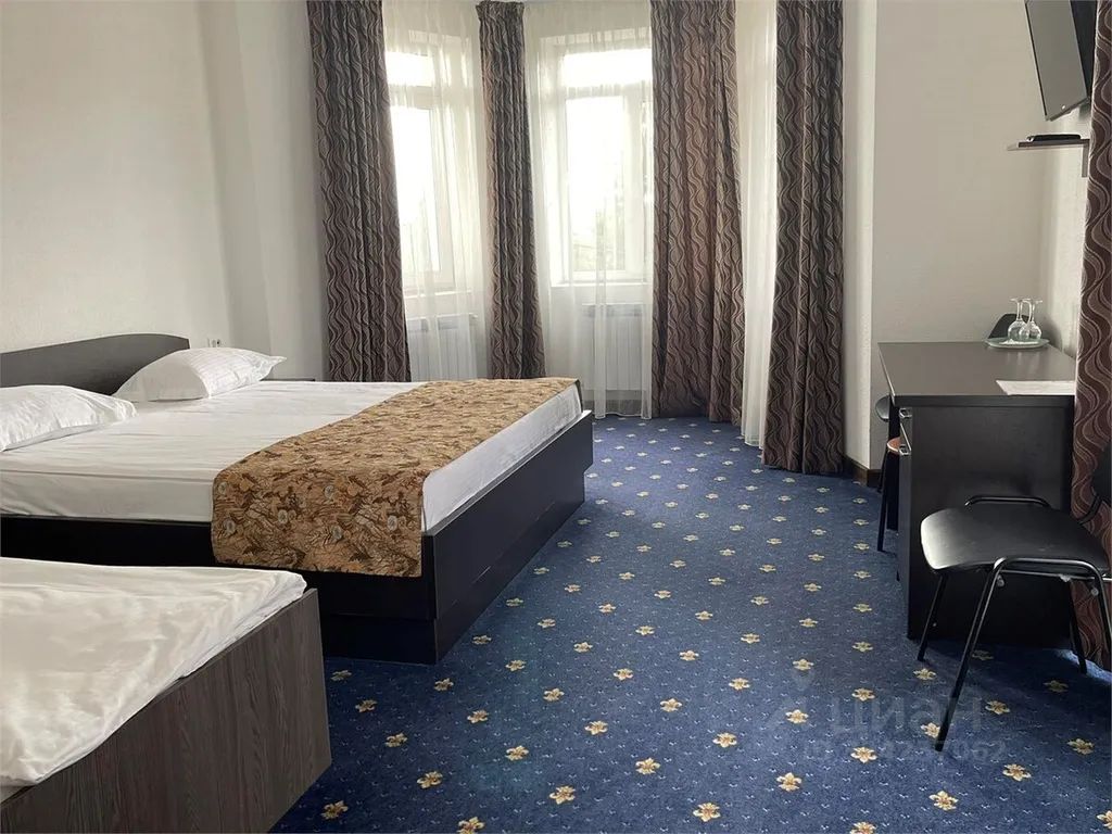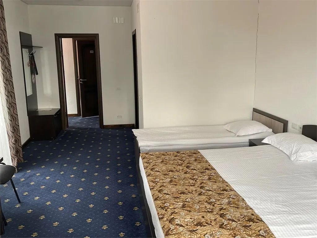 Однокомнатный просторный номер в отеле. В номере одна 2-спальная кровать и одна 1-спальная кровать, прикроватные тумбочки, шкаф, стол стул, телевизор, санузел, душевая кабина, ковровое покрытие.