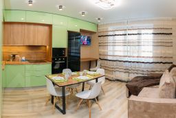 Индивидуальное газовое отопление позволит создать комфортную температуру для проживания и исключает перебои с горячей водой. Просторная кухня-гостиная, оборудованная новой современной техникой и мебелью: индукционная варочная поверхность, духовой шкаф, посудомойка, микроволновка, холодильник, смарт ТВ, двуспальный диван в зоне релакса, 3 раздельные комнаты, 2 полноценные спальни с двуспальными кроватями, вместительными шкафами и современной интерьерной подсветкой, гостиная с двумя диванами системы евро-книжка Boss, СмартТВ и выходом на уютную лоджию,с панорамным остеклением, на которой можно комфортно курить. 2 санузла: один комплексный - ванна, раковина и туалет, фен, Утюг, гладильная и сушильная доски. Полный комплект белоснежного белья по количеству гостей, банные полотенца, гигиенические средства.