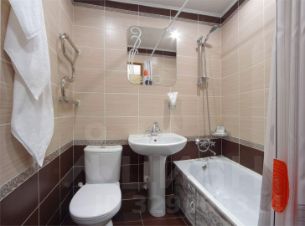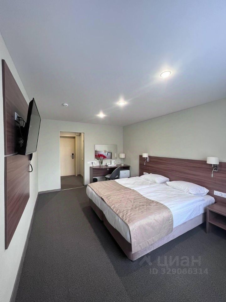 Однокомнатный номер. Площадь 17 кв. м. Комната: одна двуспальная кровать, прикроватные тумбы, письменный стол, стул, зеркало, телевизор, телефон, холодильник,прикроватные светильники, настольная лампа. Прихожая со встроенным шкафом для одежды. Отдельный санузел с мини-ванной.