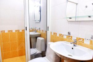 (2-спальная кровать из массива дуба, ТВ, холодильник, чайник), санузел с душевой кабиной, холл. Вид из окон на территорию базы.. Количество номеров -4.