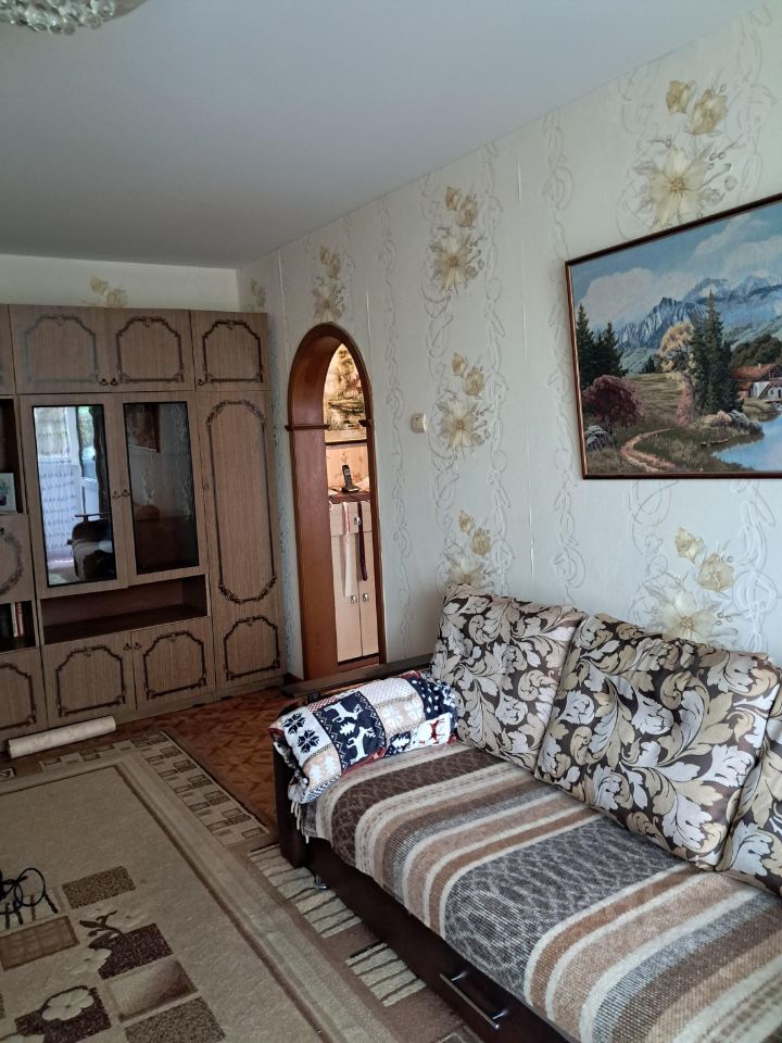 В комнате диван, два разкладных кресла, круглый стол, стенка для хранения вещей, телевизор, комод. Лоджия застекленная, что позволяет использовать ее, как дополнительное пространство. Санузел совмещенный и оснащен ванной, шкафчиком с умывальником и водонагревателем.
