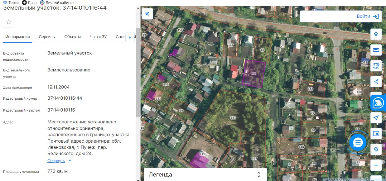Земельный участок с кадастровым номером 37:14:010116:44 площадь 772 по адресу обл. Ивановская, г. Пучеж, пер. Белинского, дом 24