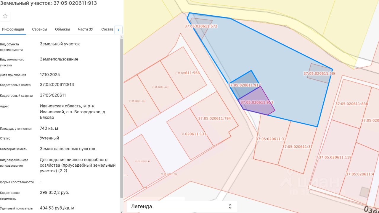 Право собственности на земельный участок из земель категории "Земли населенных пунктов", с кадастровым номером 37:05:020611:913, расположенный по адресу: Ивановская область, м.р-н Ивановский, с.п. Богородское, д Бяково, площадью 740 кв.м, с разрешенным использованием "Для ведения личного подсобного хозяйства (приусадебный земельный участок) (2.2)", в границах, указанных в выписке из ЕГРН.