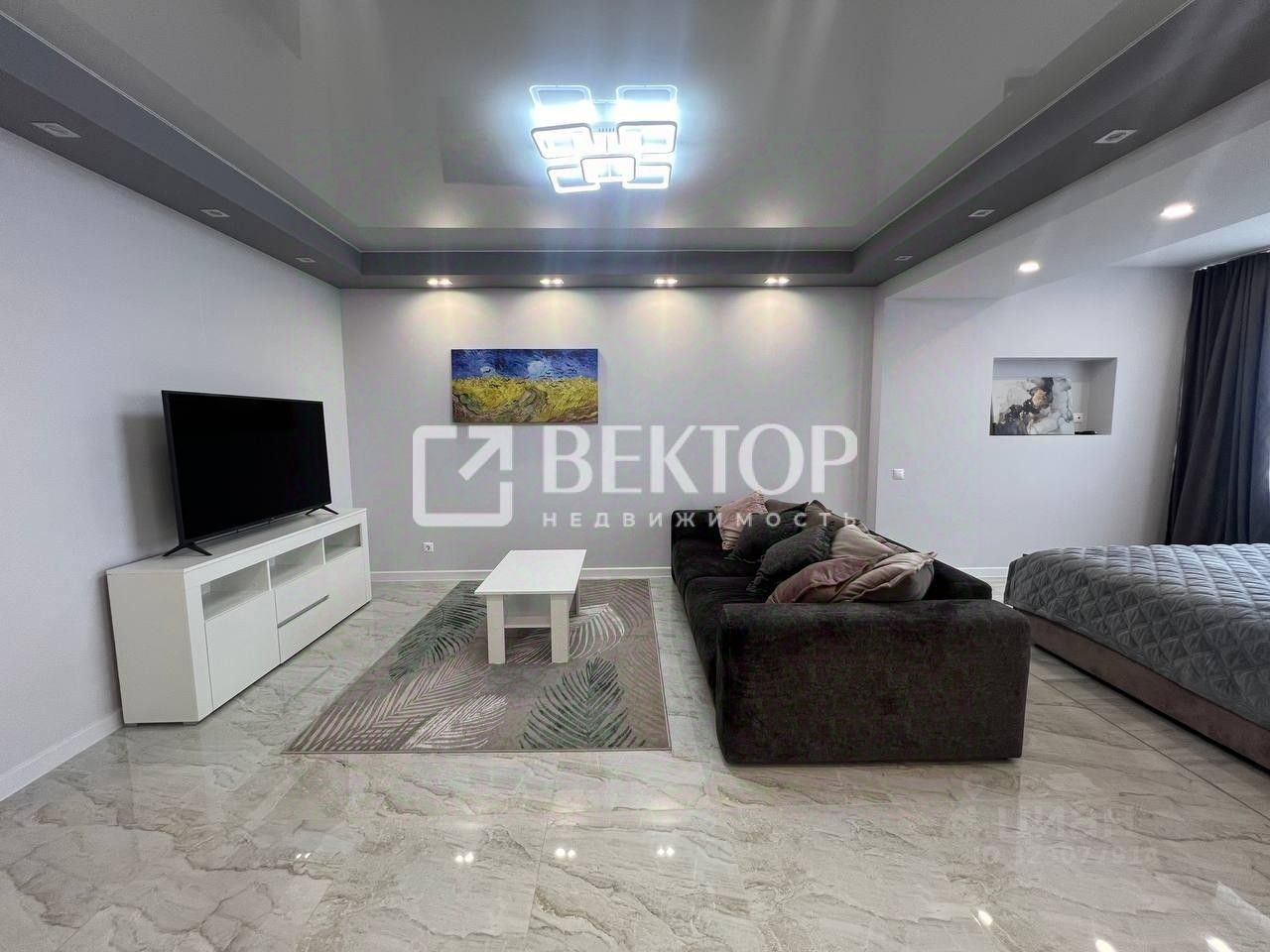 - Уютная зона отдыха: большой диван, тумба под ТВ