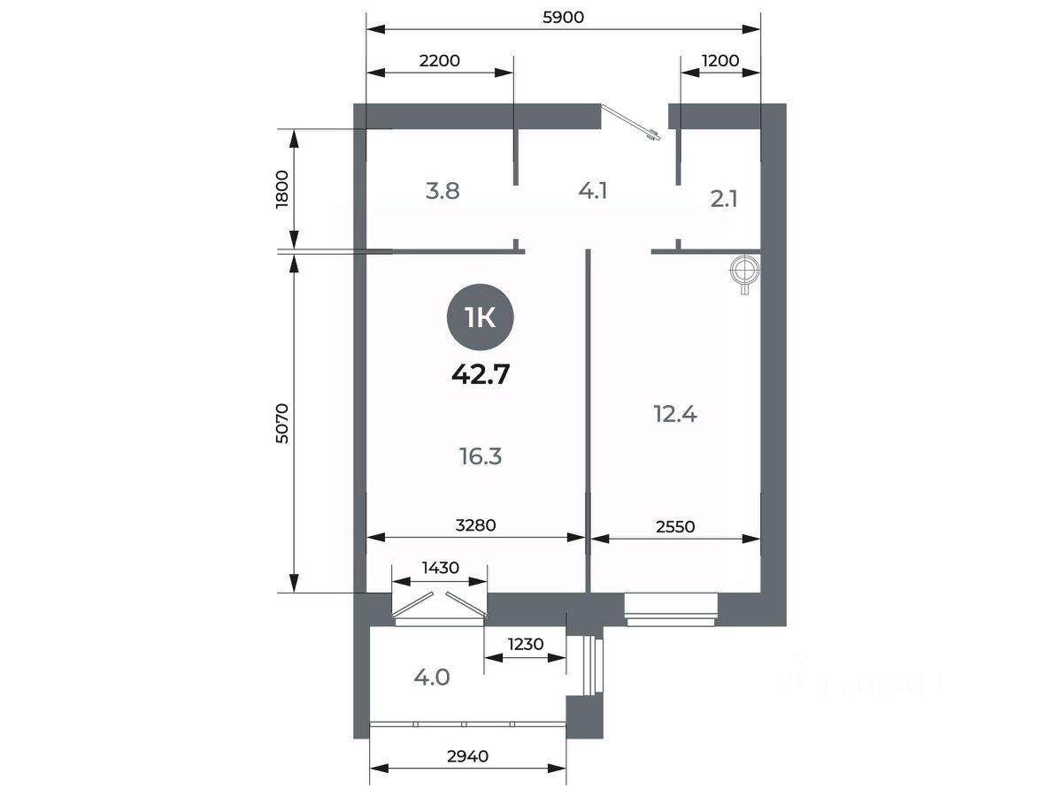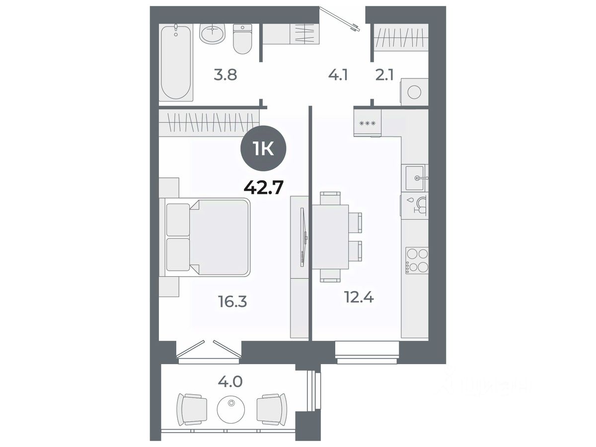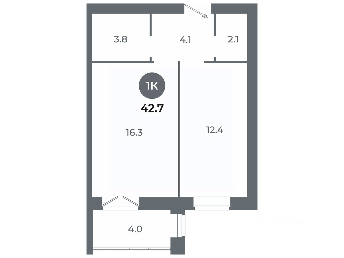 Квартира свободной планировки, 42,7 м²