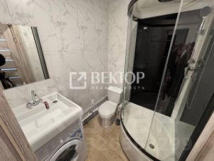 Кухня оборудована необходимой техникой, включая стиральную машину. В комнате установлен удобный диван и обеденный стол с двумя стульями - всё готово для вашего комфортного проживания. Санузел совмещённый, оснащён всем необходимым