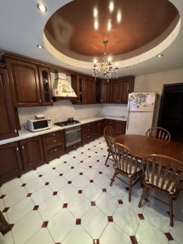 Она выполнена из массива натурального дерева итальянского производства, что сразу ощущается в качестве и эстетике. Столешница из искусственного камня практична и долговечна. Кухня полностью укомплектована техникой: