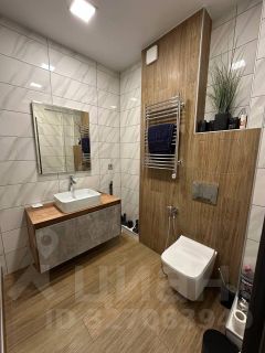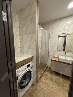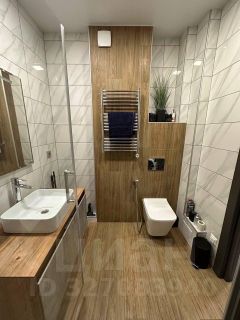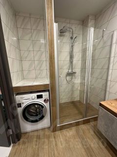 - В ванной комнате электрический полотенцесушитель, теплый пол, гигиенический душ, просторная душевая, удобное место для стиральной машины, подвесные ящики.