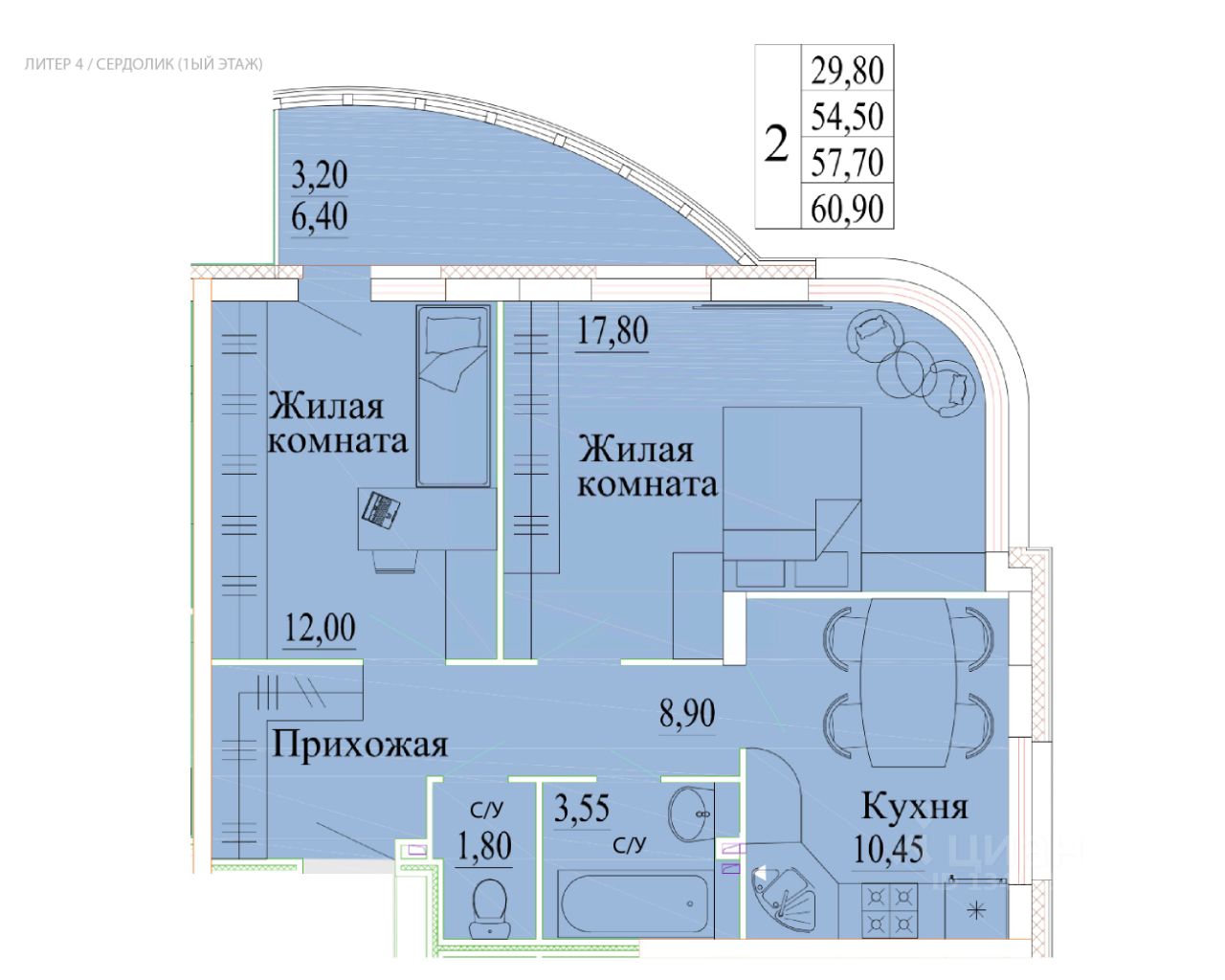 60,9 м²
