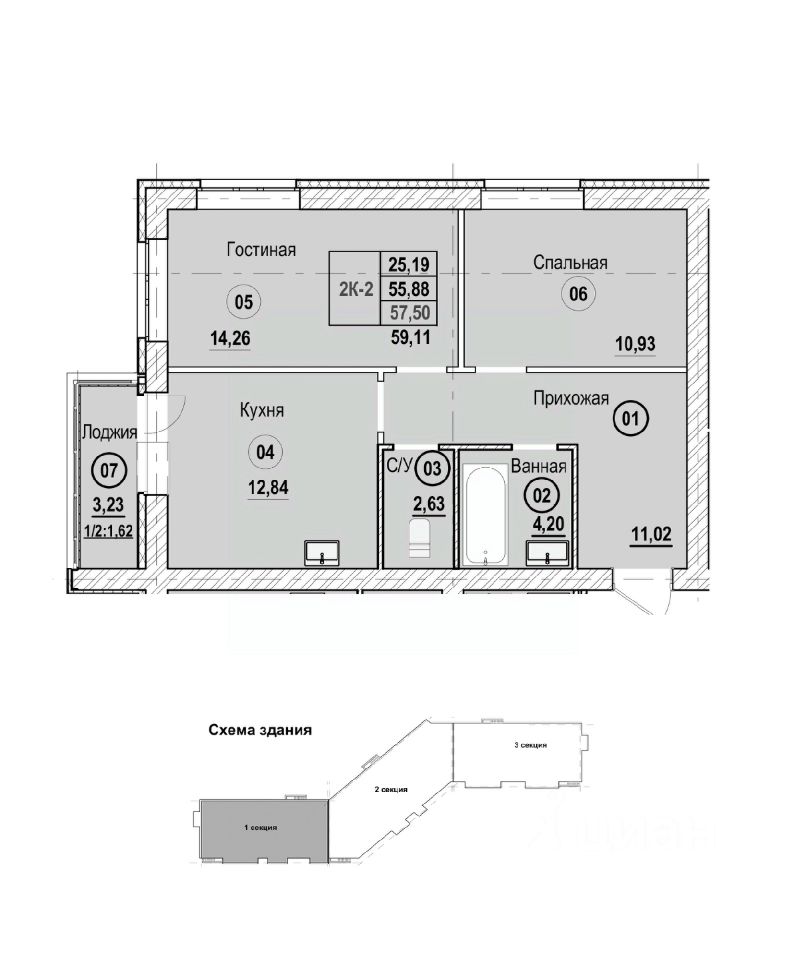 Продаётся 2-комнатная квартира в строящемся доме (Литер Б), срок сдачи: II-кв. 2028, общей площадью 59.11 кв.м., на 2 этаже. Новый жилой комплекс "Новая Дерябиха 4" от застройщика "ГК СМУ 1" расположен по адресу: Ивановский район, деревня Дерябиха.