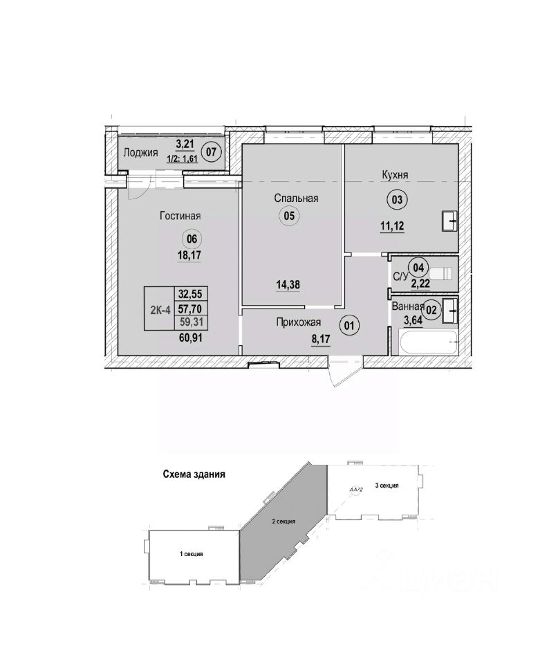 Продаётся 2-комнатная квартира в строящемся доме (Литер Б), срок сдачи: II-кв. 2028, общей площадью 60.91 кв.м., на 1 этаже. Новый жилой комплекс "Новая Дерябиха 4" от застройщика "ГК СМУ 1" расположен по адресу: Ивановский район, деревня Дерябиха.