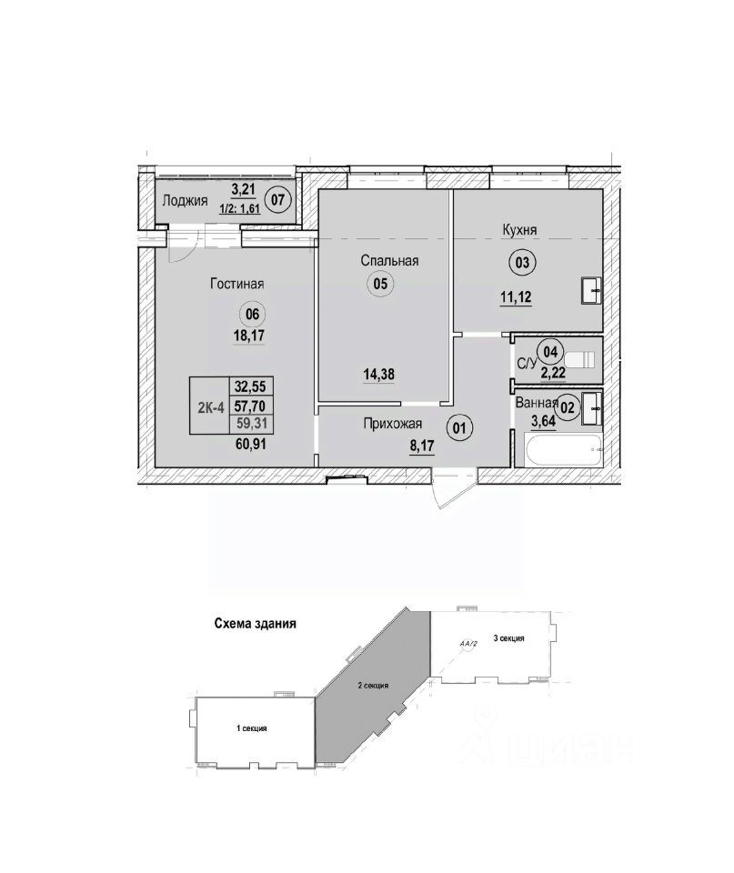 Продаётся 2-комнатная квартира в строящемся доме (Литер Б), срок сдачи: II-кв. 2028, общей площадью 60.91 кв.м., на 4 этаже. Новый жилой комплекс "Новая Дерябиха 4" от застройщика "ГК СМУ 1" расположен по адресу: Ивановский район, деревня Дерябиха.