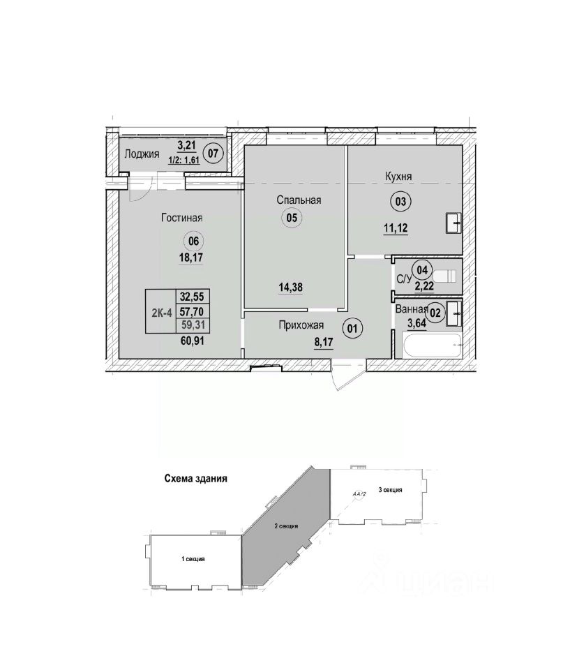 Продаётся 2-комнатная квартира в строящемся доме (Литер Б), срок сдачи: II-кв. 2028, общей площадью 60.91 кв.м., на 6 этаже. Новый жилой комплекс "Новая Дерябиха 4" от застройщика "ГК СМУ 1" расположен по адресу: Ивановский район, деревня Дерябиха.