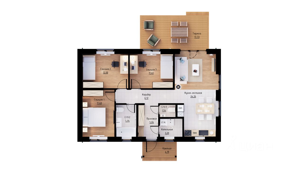 Плaнировкa: куxня-гостиная, 3 спaльни, 2 санузлa.