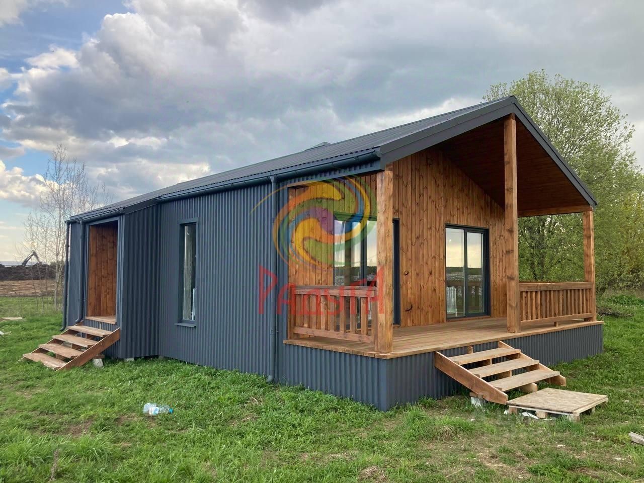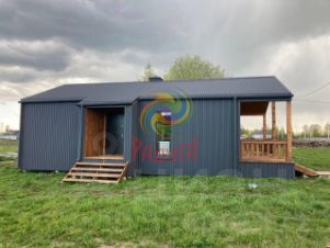 Крыша и фасад - профилированный лист, так же вставки по фасаду - окрашенная имитация бруса.