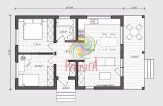 В доме тепло и просторно. Светлая кухня-гостиная 26 кв. м. с панорамными окнами - выходами на террасу. Площадь дома без учета террасы 63,8 м2.