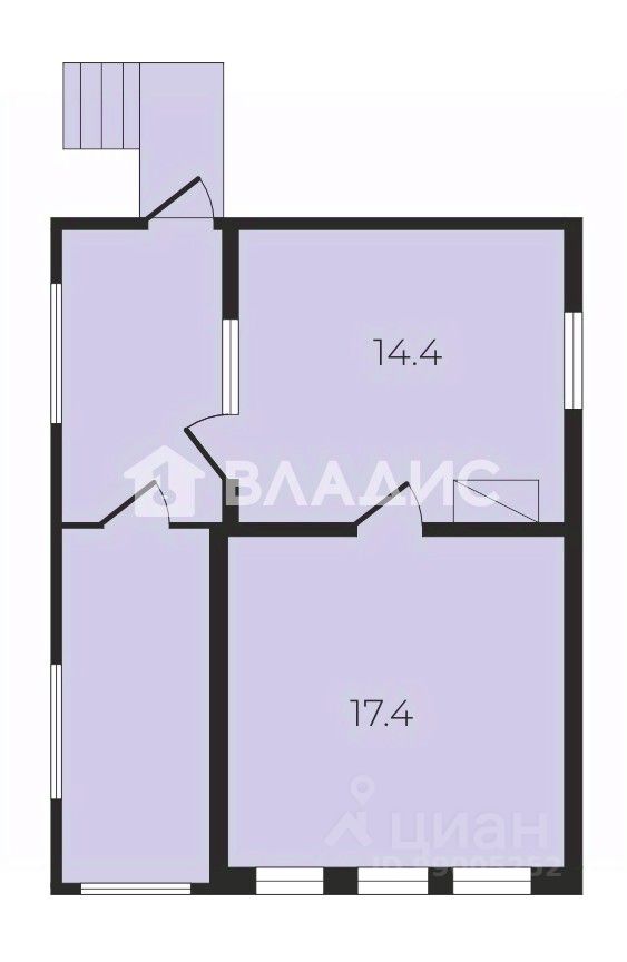 Внутри — 2 комнаты, жилая площадь 17 кв. м, кухня 14 кв. м.