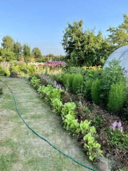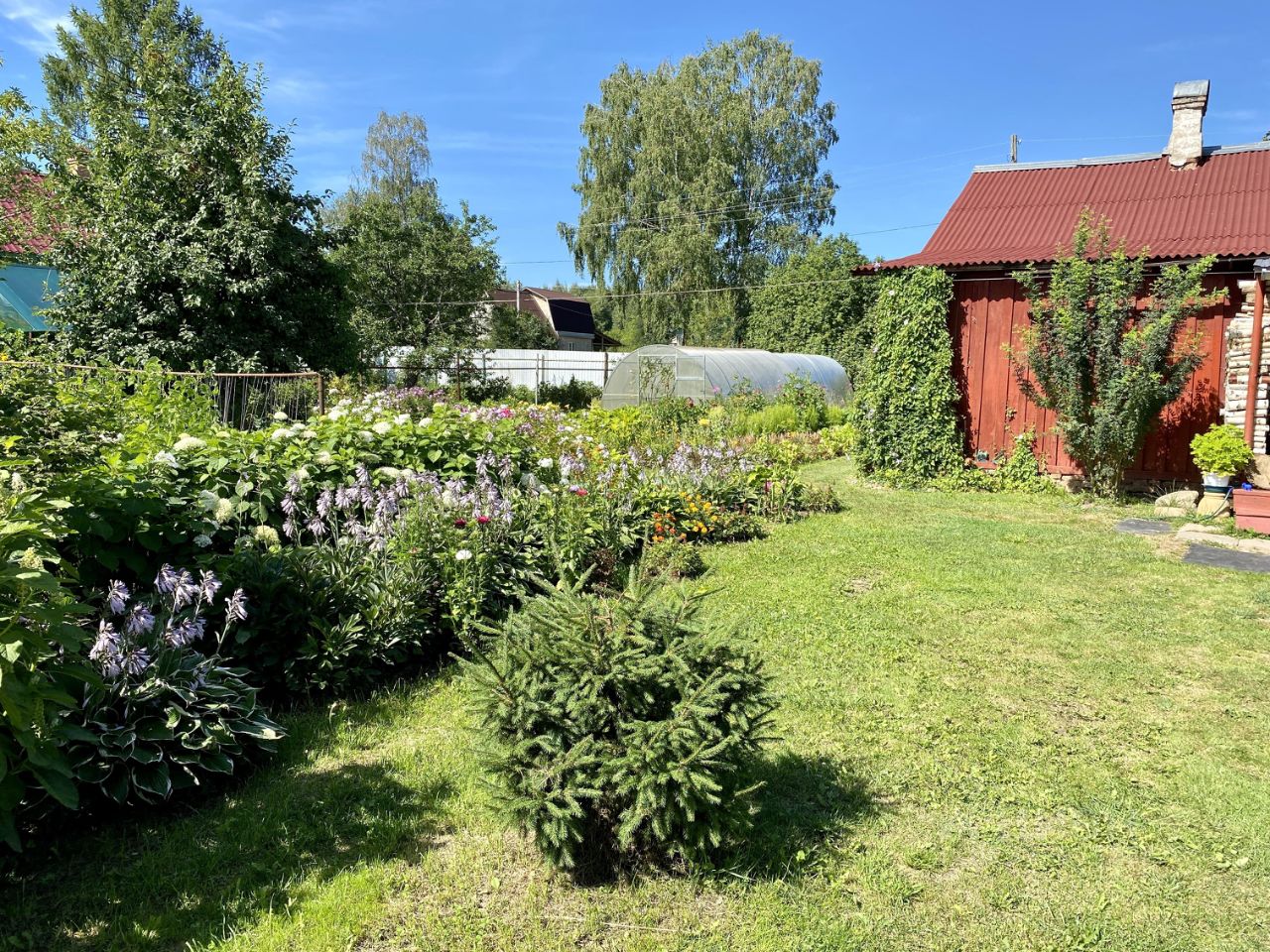 • Многолетние цветы и кусты. Яблоня. Теплица из поликарбоната