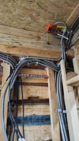 Электрика реализована на ввод кабелем 3х10 медь( ввг нг лс) и разводкой по дому проводом 3х2,5 ппг нглс и ввг нг лс , все кабеля в металорокуве, потрачено было около 500-метров , везде где необходимо проводка идет в металорукаве .В прихожей , портале , спальне и кухне имеются закладные и подключеные блоки питания 24в под диодную ленту для тех кто захочет подсветку потолка пола и фартука на кухне.фото есть